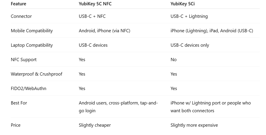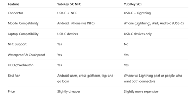 1. Quick Comparison: YubiKey 5C NFC vs YubiKey 5Ci